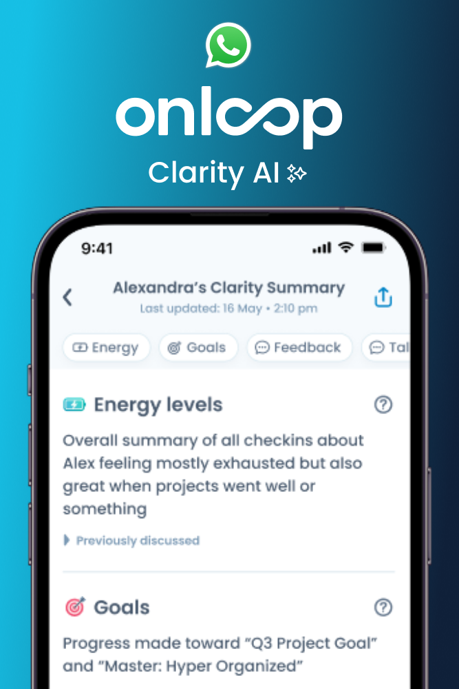 Achieve peak productivity for your team members with the help of our agent. Create structured and actionable summaries for your next 1:1s, easy to use through WhatsApp.